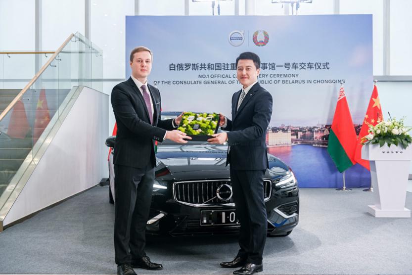 沃尔沃汽车集团大中华区销售公司新业务发展部大客户销售总监王深刚先生向白俄罗斯共和国驻重庆总领事馆德米特里.叶梅利亚诺夫总领事先生交付一号公务用