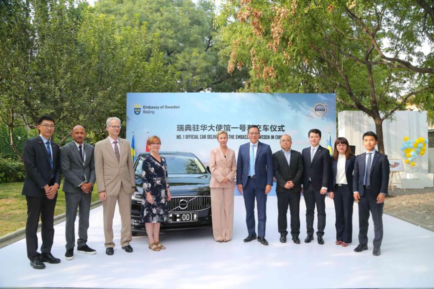 沃尔沃汽车集团全球高级副总裁、沃尔沃汽车亚太区总裁兼CEO袁小林先生向瑞典驻华大使宋莲女士(Helena-Sångeland)交付一号公务用车