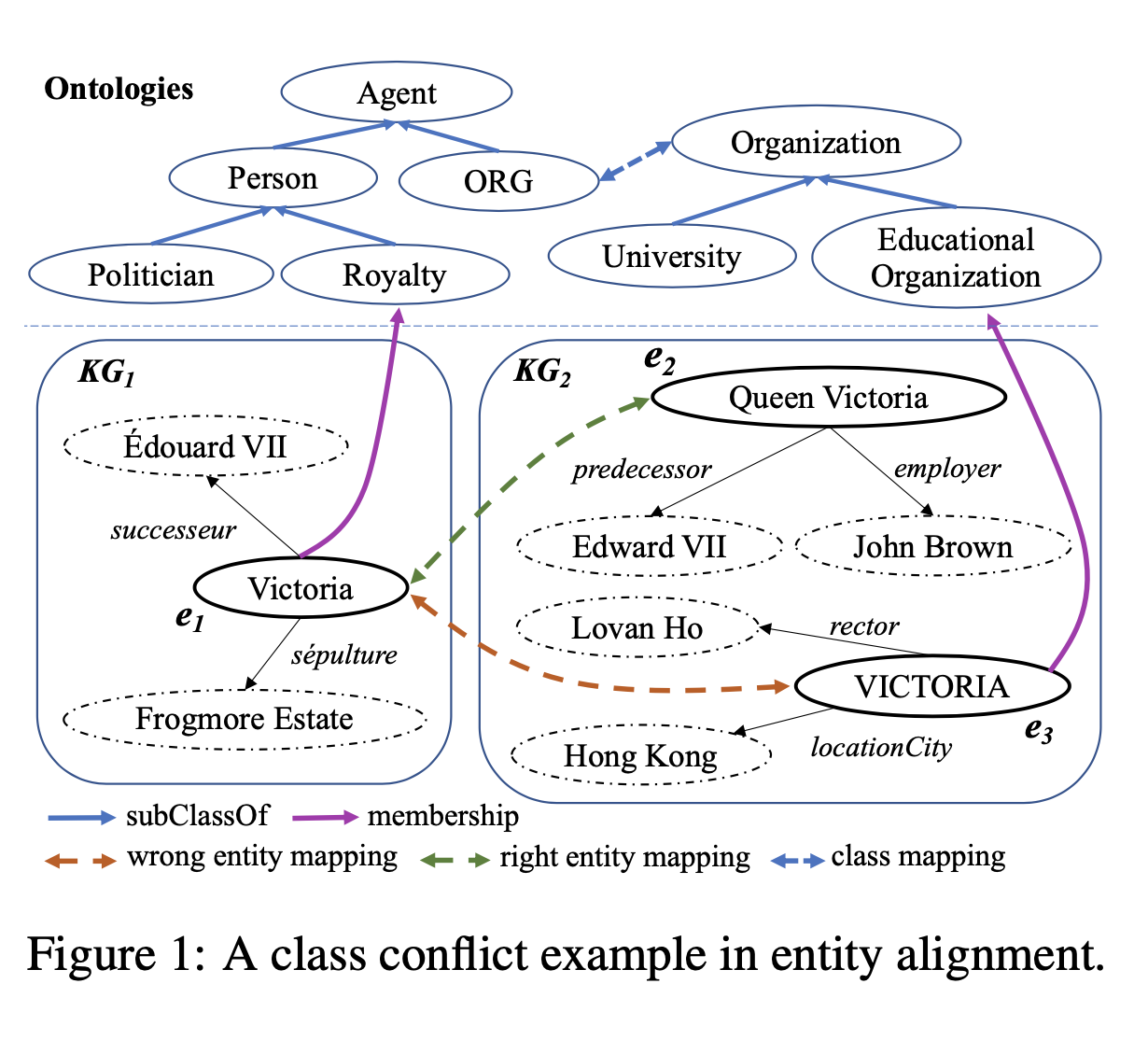 知识图谱表示学习常常用在知识图谱对齐任务上,但是目前的表示学习模型通常只会建模图结构信息、实体名称信息、实体属性信息,而没有考虑知识图谱的本体信息。本体定义了知识图谱的元信息以及实体的类别信息,在知识图谱及其应用中有重要作用。在论文中,天衍实验室提出了一种基于本体指导的知识图谱对齐模型(OntoEA),将知识图谱和本体层级信息共同进行建模,来发现并避免错误实体对齐中的类别冲突(class conflict)。天衍实验室提出的OntoEA模型在多个公开数据集和一个工业数据集(医疗知识图谱)上均超过了现有的知识图谱对齐模型,这也证明了引入本体信息的有效性。