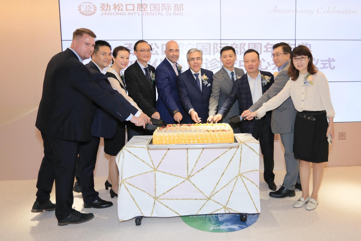 致辞环节结束之后,伴着《爱的礼赞》的乐声,特邀嘉宾、京城俱乐部会员艾哈桑先生,瑞士驻华首席投资官Roger Germann先生,中信和业投资有限公司党委书记 董事长 、京城俱乐部有限公司董事长杨劲先生,EMS大中华区总经理乌建光先生,劲松口腔首席执行官马志欣先生,劲松口腔国际部首席医疗官汪晓晖院长、颜面管理中心院长史真教授、种植中心高相仪院长、正畸院长刘丽博士再度携手登台,一起为国际部增彩庆生、为嘉宾切分庆典蛋糕。