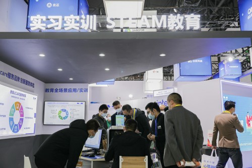 在实训展示区,统信教育展示了STEAM教育的硬件教具、软件平台、学习课程和教学云平台等内容,包含图形化编程、人工智能、物联网、机器人、3D设计等。展位上的全息智能教育、青少年编程、物联网创客等产品引起观展人群的浓厚兴趣,纷纷上机体验。