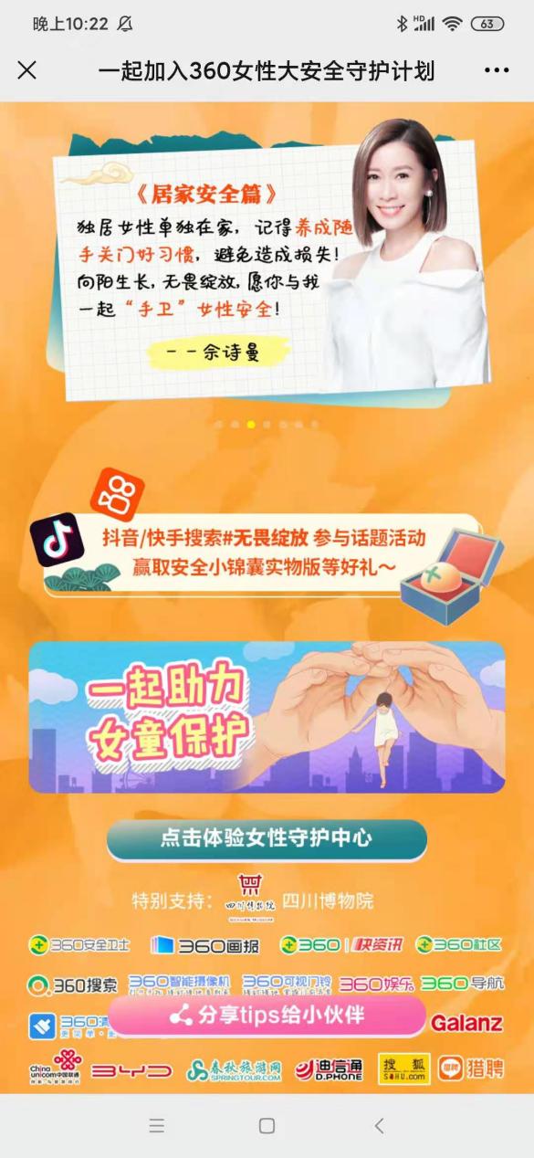 截止目前,360手机卫士“女性大安全守护计划”已累计推行四季,吸引了社会各界广泛参与。自360手机卫士“女性守护中心”上线以来,已帮助550.28万名女性用户,守护女性用户人身安全、隐私安全790.54万次。