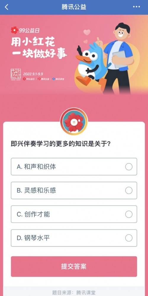 9月1日起,腾讯课堂APP上线“99公益日”答题公益活动,用户打开腾讯课堂APP点击“99公益日用小红花一块做好事”活动页面,即可参与答题捐赠公益小红花行动,助力公益梦想落地开花。