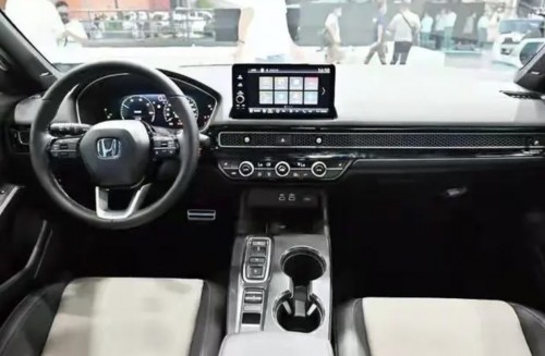 来到车内,可以看到思域e:HEV采用了按键式换挡操作,这让喜欢操纵感的年轻人或许有些失望了。另外,其中控屏采用悬浮式设计,而中高配车型则使用三幅式多功能真皮方向盘搭配10.2英寸全液晶仪表,中控屏周围配有实体按键,空调旋钮以及控制按键得以保留,虽然看起来中规中矩,但实用性不错的。