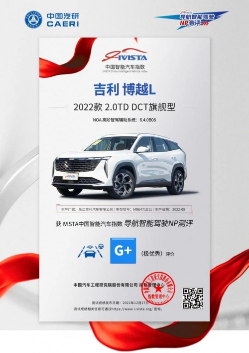 2022年12月27日,中国汽车工程研究院股份有限公司(简称:中国汽研)发布了IVISTA首批导航智能驾驶NP测评结果,吉利汽车凭借智能驾驶创新研发成果——NOA高阶智驾辅助系统荣获最高等级的G+成绩,同时也是首批参加IVISTA导航驾驶测试评价验证并获得认证的两家车企之一。