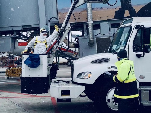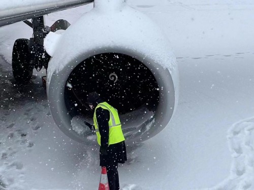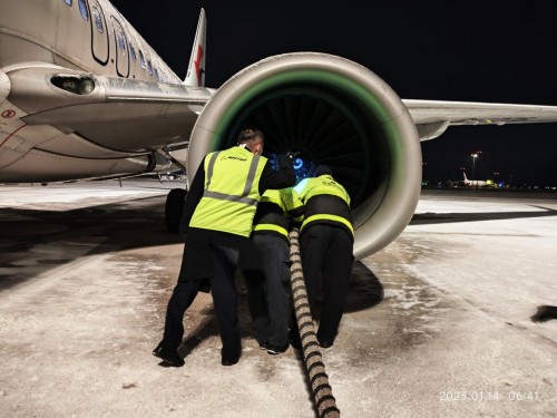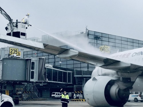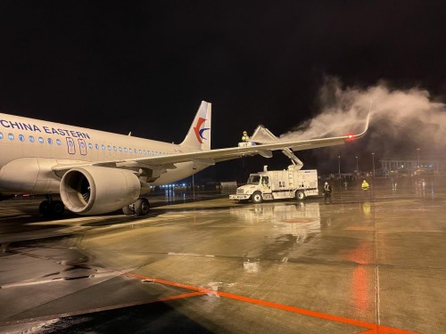 1月13日晚至1月14日,山西太原在北方小年这天迎来2023年的首场降雪。零下15摄氏度的气温下,漫天飘舞的雪花迅速覆盖了机坪并形成一层薄冰。整个机坪到处有东航机务维修人员的身影,除冰工作人员按照工卡手册,与除冰车司机娴熟配合除冰,对于翼根、翼尖等重点部位的透明冰,除冰员与机组反复进行确认,保证飞机不带冰雪霜起飞。(下图)