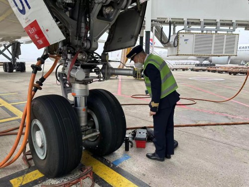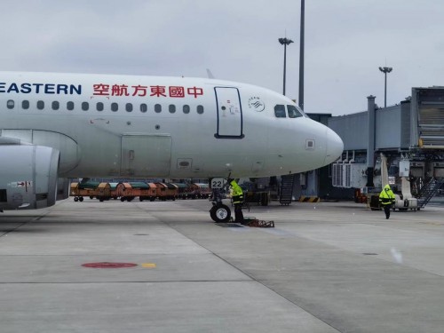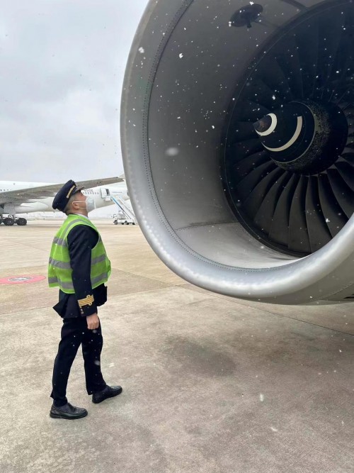 1月15日,东航MU5007上海浦东-台北桃园航班机组冒着小雪,在机坪上认真细致地检查飞机,确保飞机处于适航状态,为安全飞行做好准备工作。(下图)