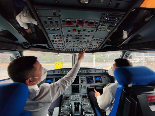 驾驶舱外大雪纷飞,驾驶舱内热火朝天。1月15日上午11点,执行东航MU5261虹桥-成都航班任务的机组成员认真有序地进行起飞前最后的准备工作。遇到上海难得有的降雪天气,机组们全力对应,全力保障“平安春运”。(下图)