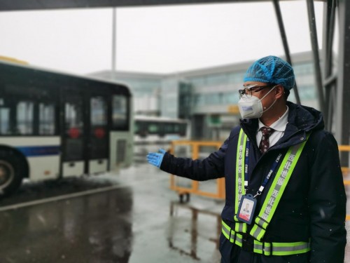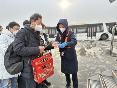 1月13日,西安咸阳国际机场飘起了雪花。摆渡车提前打开车内空调,让旅客在寒风中感受到东航的温暖。远机位登机口工作人员严格控制航班客梯车上下客人数,组织旅客放缓登机或下机速度,“请注意脚下,当心!”工作人员不厌其烦地一遍遍提醒、告知旅客注意上下机安全,并重点对特殊旅客、老人小孩加强关注。(下图)