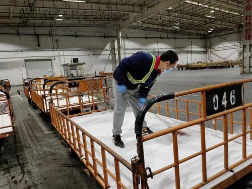 1月14日下午南京禄口国际机场遇到寒潮降雪,东航物流南京分公司组织干部员工对架子车上的积雪进行清扫,确保雨雪天气下航班任务顺畅。(下图)