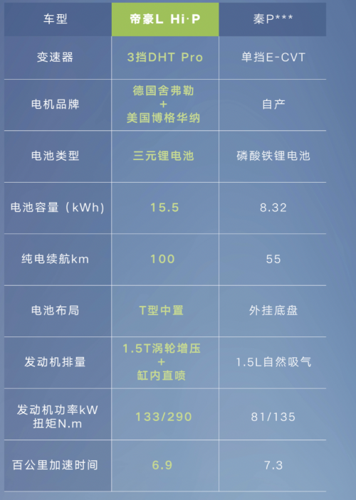 如果大家仔细审题,就会发现9.98万元的秦Plus DM-i纯电续航只有55km,而帝豪L Hi·P全系标配100km纯电续航,真正做到降价不降质,始终把品质性能放在第一位。毕竟混动车型最能吸引消费者的是它优于燃油车的性能和优于纯电车的综合续航水平,所以,混动的技术一定是排在第一位。帝豪L Hi·P是吉利雷神混动平台的首款插混车,采用的是雷神电混技术,由1.5T发动机、电机和3挡变频电驱DHT Pro组成,其中发动机最大功率133kW,最大扭矩290N·m,电动机的总功率为100kW,总扭矩320N·m。此外,如下图所示,两款车在硬件上差距还是比较大的。