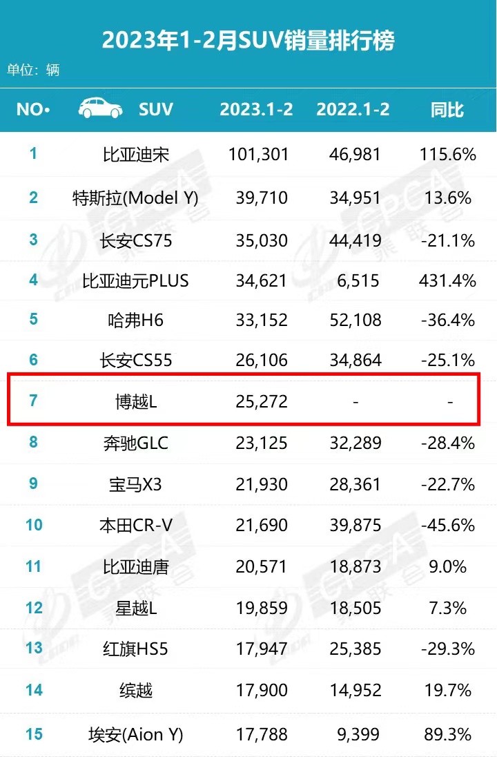 1-2月份国内SUV销量榜前15名中,除了外资独资的特斯拉Model Y、合资车只有奔驰GLC、宝马X3、本田CR-V这三款车入席,而之前榜上常客丰田RAV4/威兰达、日产逍客等等,这次都跌出榜单,剩下清一色都是咱们中国品牌车型。由此可见,中国品牌SUV市场内的表现十分稳健,1-2月份共有11款国产SUV车型上榜。