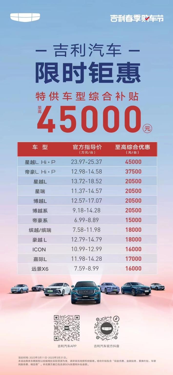在全行业都在掀桌子的时候,吉利也拿出了春季购车福利:博越L现金优惠8000元,综合优惠可达20500元。想冲智能SUV的朋友们,这波福利千万不可错过。