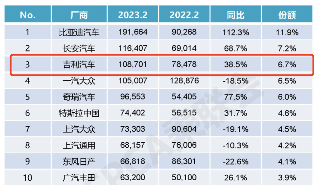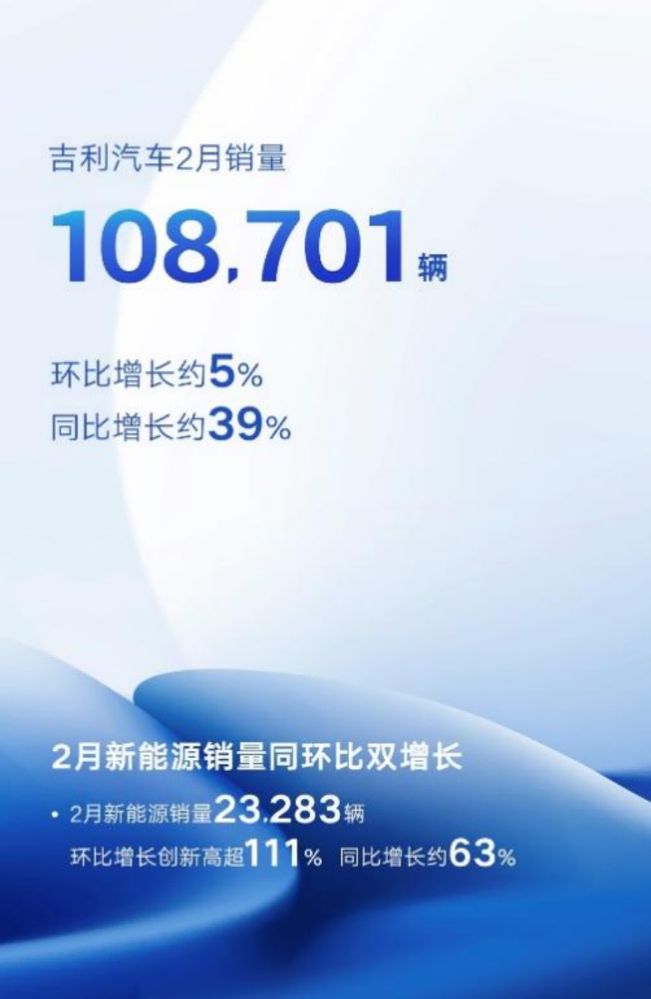 2023年汽车市场的开局遇冷,根据乘联会最新数据显示,今年1-2月累计销量同比下降19.8%,整体市场愈加艰难。但就是在这种重压之下,吉利汽车2月销量迎来了“小爆发”。近日,吉利汽车公布最新销量数据:2月乘用车销量108701辆,环比增长超5%,同比增长约39%,在汽车销量榜单中排名前三。其中最亮眼的表现在新能源领域,销量较1月实现翻番,达到23283辆,环比增长超111%,同比增长约63%,旗下极氪、几何等新能源品牌均实现了同环比双增长。同时,吉利还发布了全新中高端新能源系列“吉利银河”,迈入全面向新发展新阶段。