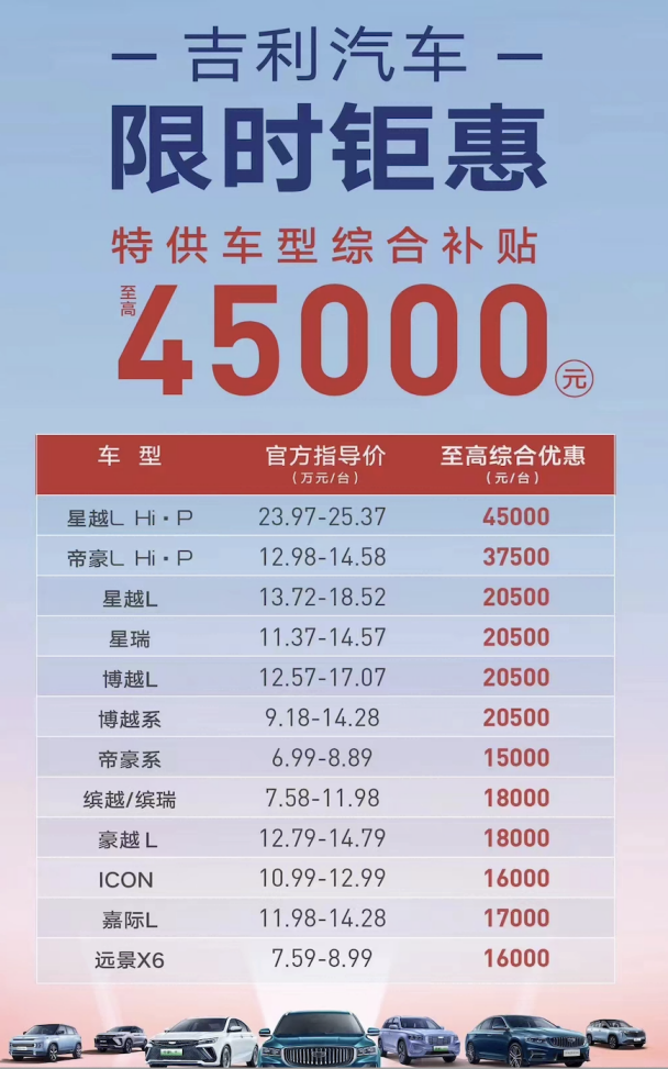 值得一提的是,面对购车需求爆棚的消费者,吉利也推出了限时钜惠,特供车型综合补贴至高45000元,帝豪L Hi·P至高综合优惠也有37500元,合下来10万元不到就可以拿下这款高科技插电混动轿车。吉利旗下其他车型也有现金优惠活动,有意向的朋友这是最好的购车时机了,机不可失!