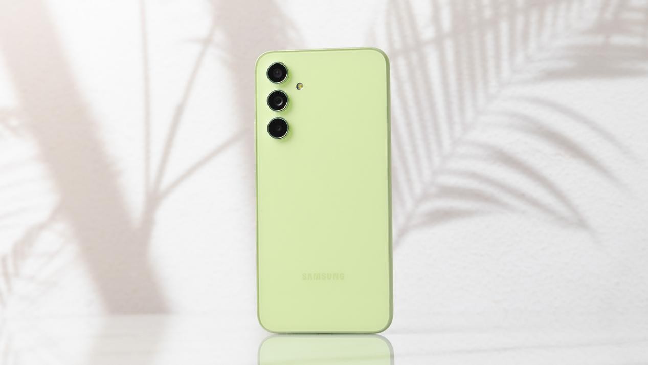 三星Galaxy A54 5G的外观给人留下第一印象就是散发着简约、淡雅的气质,我手里的这款三星Galaxy A54 5G采用的是鲜柠绿配色,这种配色在国产机型中较为少见,绿色的饱和度不高、整体色调较浅,有点像是初春时节青草的颜色,给人营造出一种生机焕发的感觉。另外还有深岩黑、雪雾白、浅薰紫等其他配色可选。机身背板采用康宁大猩猩玻璃材质打造,质感温润如玉,同时也不易沾染到指纹,还具有出色的耐刮花能力。