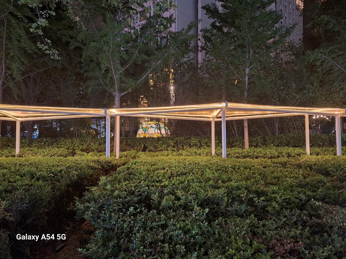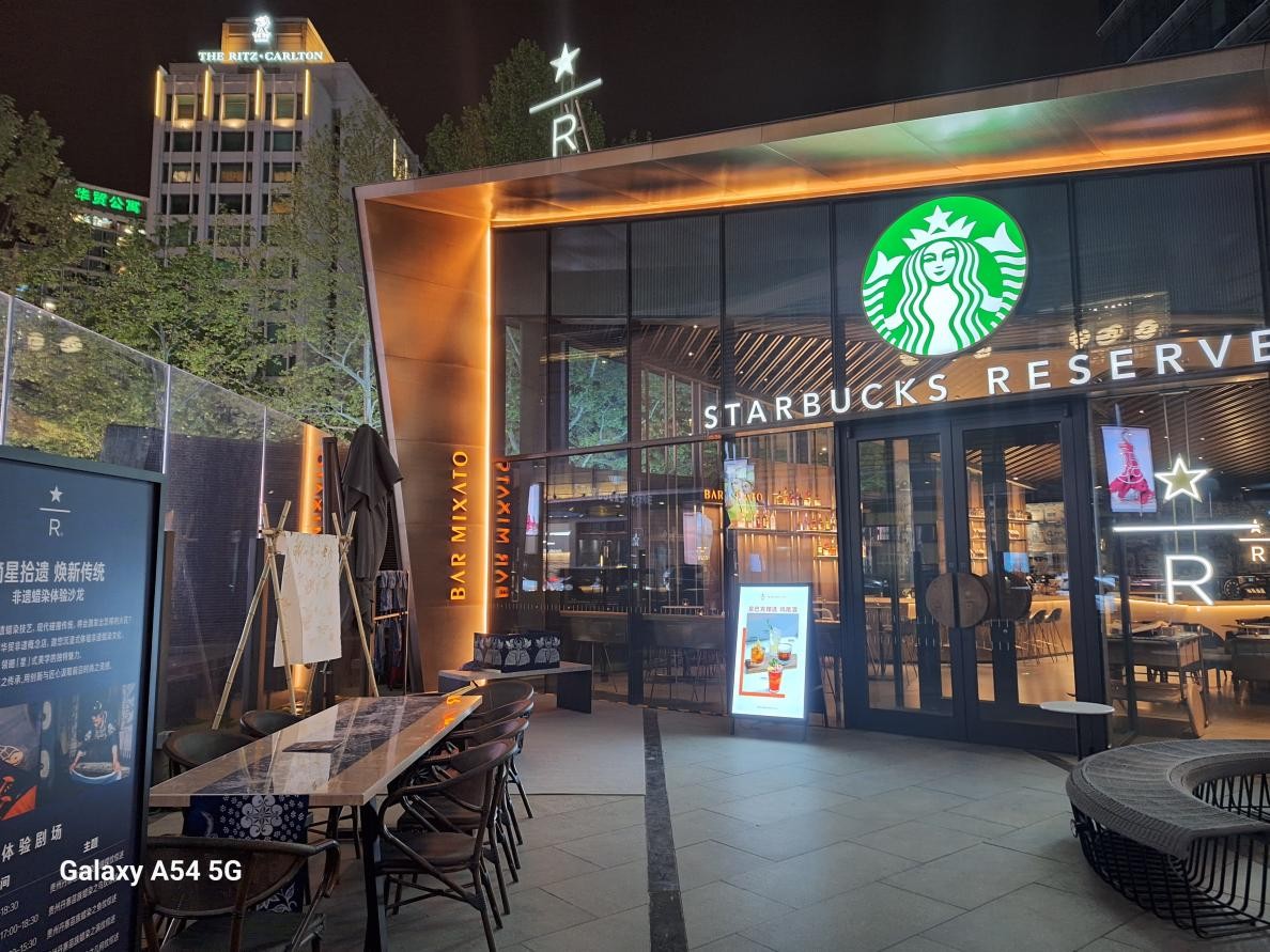 主摄F1.8的超大光圈让三星Galaxy A54 5G拥有非常出众的夜景拍摄能力。从这张咖啡店夜景样张可以看出三星Galaxy A54 5G拥有非常出色的降噪能力,照片中没有明显的噪点,画面显得非常纯净;再来看一下夜景灯牌,尽管颜色比较复杂,但是也很好地展示出不同颜色间的层次感,并且对高光之处进行了有效的压制,没有出现过曝的情况;面对较为昏暗的场景,三星Galaxy A54 5G能够对画面亮度进行有效的提升,保留更多的暗部细节。