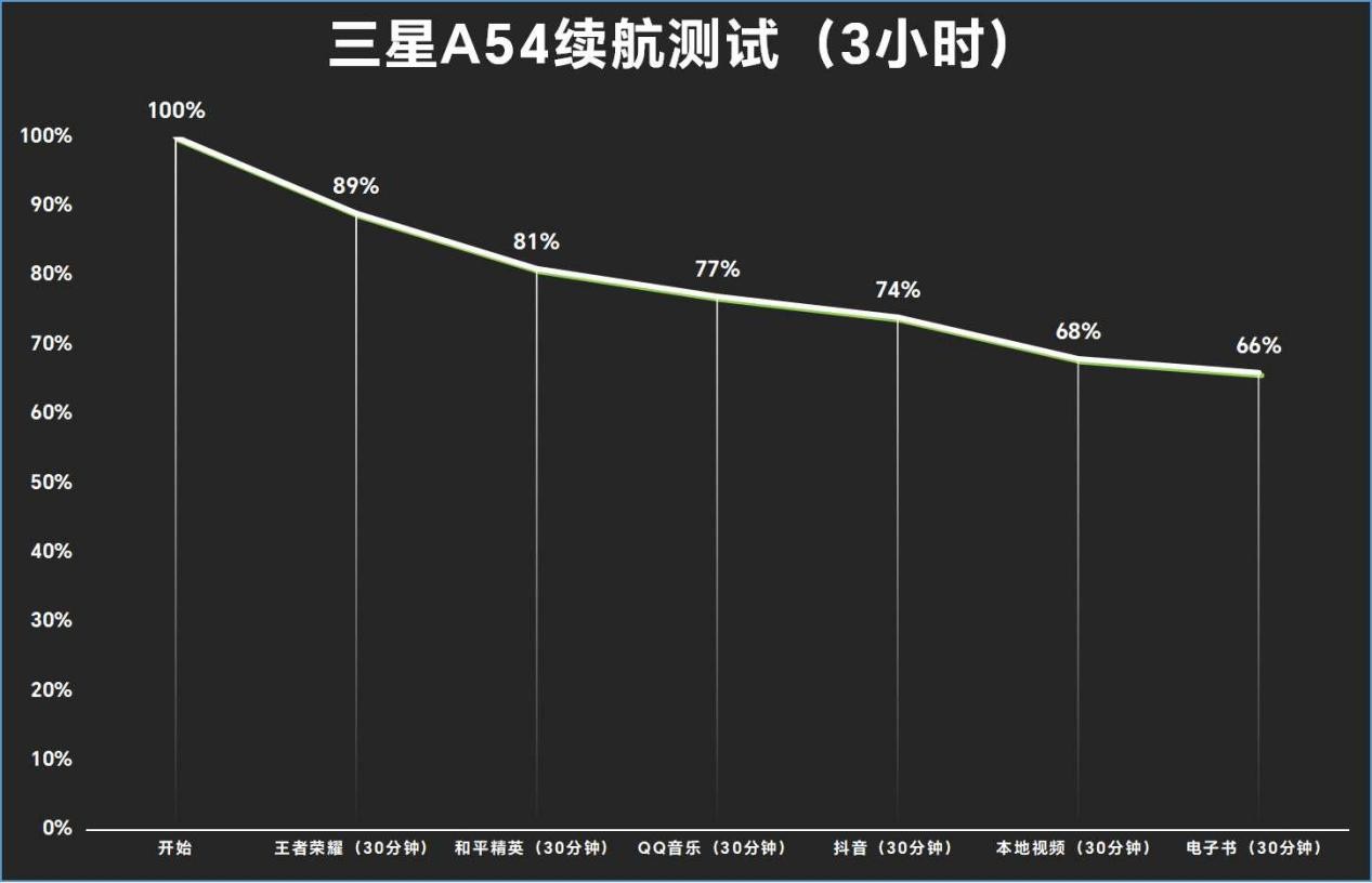 聊完了外观、影像、性能,三星Galaxy A54 5G的这些产品细节也同样不能忽略,同样也可以给可以用户带来非常舒适的使用体验。比如它在6.4英寸的小巧机身融进一块5000mAh的大容量电池,我们模拟3个半小时的各类日常使用场景进行续航测试,三星Galaxy A54 5G的剩余电量还剩66%,所以外出不必因电量而焦虑。