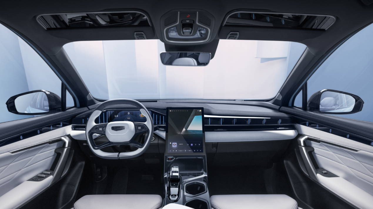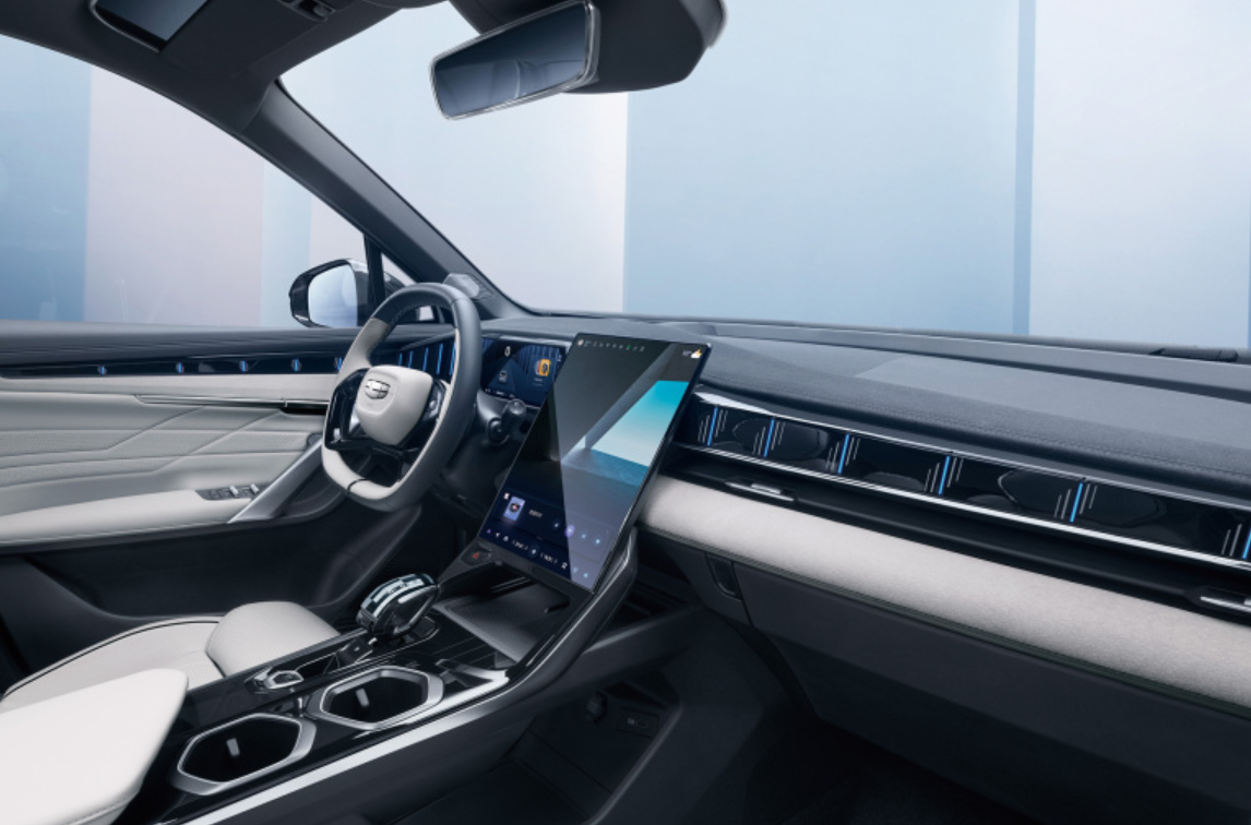 走进内饰,博越L的内饰设计与很多新能源车型有着一些相似之处,车内座舱同样主打一个“科技范”。博越L采用了双拼内饰配色,配备了13.2英寸中控竖屏、环绕式情感光幕、抗菌方向盘、晶钻挡把、头枕音响、高通8155芯片加持的全新吉利银河OS Air版等诸多数字科技感满满的配置,同时还独创了光影墨镜遮阳板、双层可调行李箱等实用性设计,展现出更高档的品质感以及层次感。其中像10.25英寸的全液晶仪表盘和13.2英寸的触控液晶屏、8155芯片等均属于全系标配。