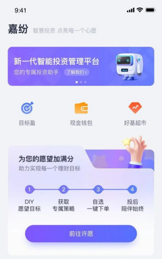 通过采用母公司自主研发的智能投资引擎,嘉纷可根据用户设置的投资偏好以及投资目标,结合大数据模型测算,让用户只需通过三步即可完成许愿,用户可制定三种专属投资方案:稳健型、平衡型、进取型,以满足不同投资偏好用户的需求。除心愿产品,嘉纷还提供目标盈、好基超市、现金钱包等,丰富用户的投资选择。同时,嘉纷继承了母公司良好的风险管理经验,能在市场波动时智能提醒,并计算出符合当前进度的投资金额,帮助用户及时调整投资策略。