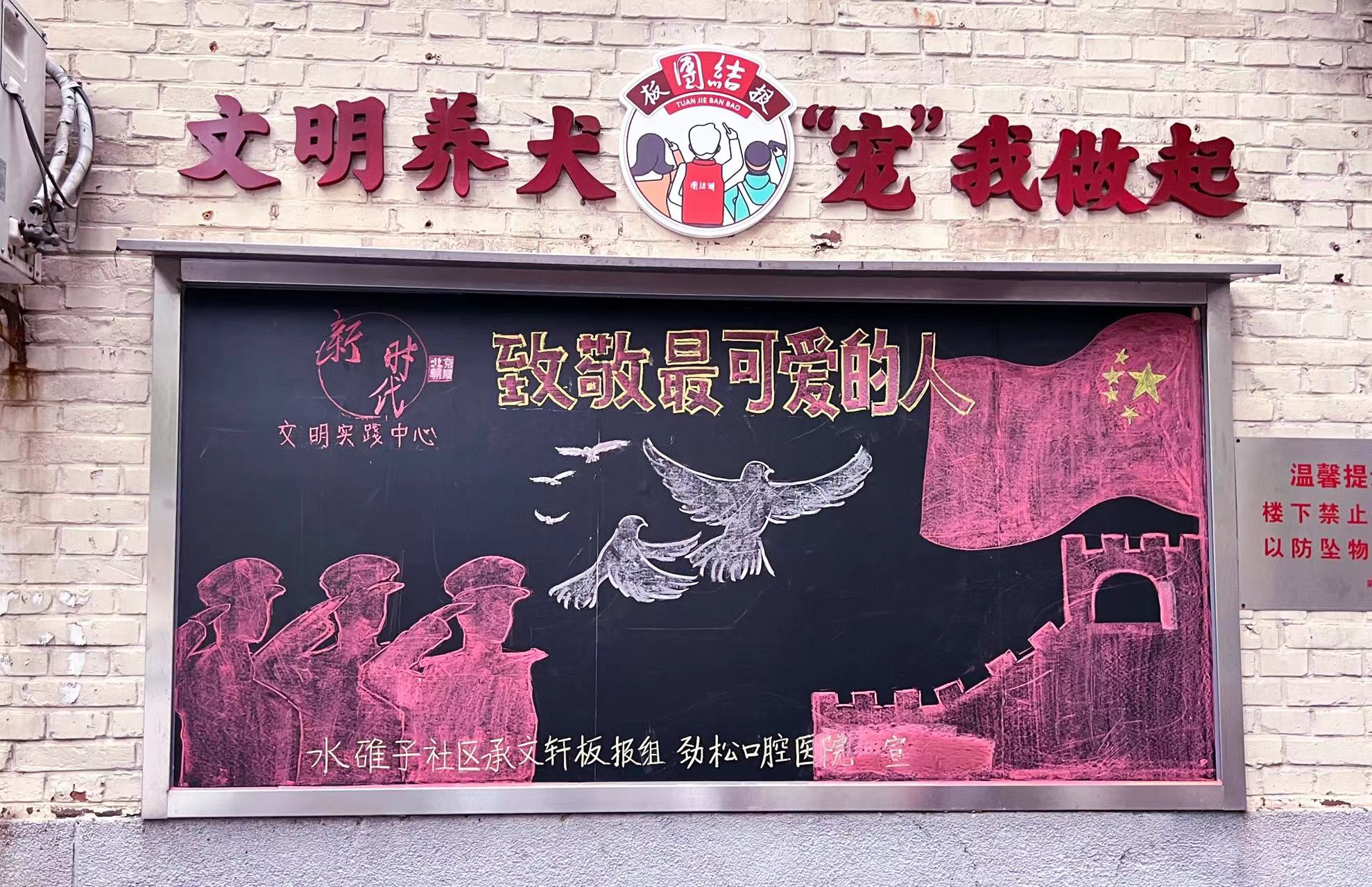 在“八一”建军节来临之际,为了表达双方共同的拥军热情,社区工作者联系劲松口腔一起参与了辖区内两块黑板报的创作工作。