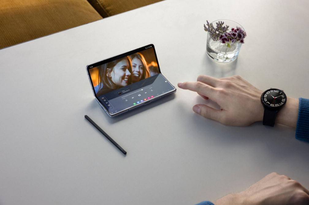 得益于可多角度旋停的铰链,以及融合场景应用的软件,三星Galaxy Z Fold5与其他折叠屏产品相比,交互方式更胜一筹。在立式交互模式下,三星Galaxy Z Fold5能够为品质生活提供更多便捷体验。比如,用户可以将手机摆在沙发、床头等位置,以更舒适的姿势观影刷剧,同时使用升级的立式交互触控板,无需中断内容播放,便可像遥控器一样自如操控视频。针对日常自拍或合影,用户只需折叠手机选定角度,并放置于平面处,就能玩转既灵活又创意的免手持拍摄,解锁更具个性的影像表达。在航站楼、出租车或咖啡厅等移动办公场景遇到工作会议,用户不必急忙翻出笔记本电脑,通过三星Galaxy Z Fold5一边视频通话、一边使用S Pen记录要点,从容解决突发事务。