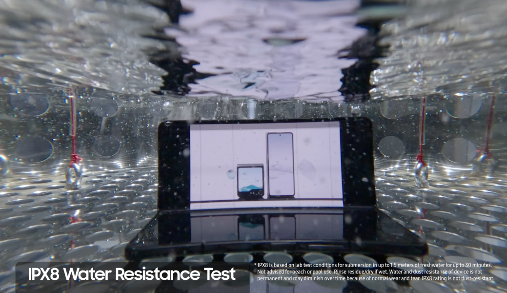 此外,在满足国际标准的基础上,三星还进行了临界值测试,例如不同角度和地板材料的自由落体测试,以及各种条件下的防水测试。