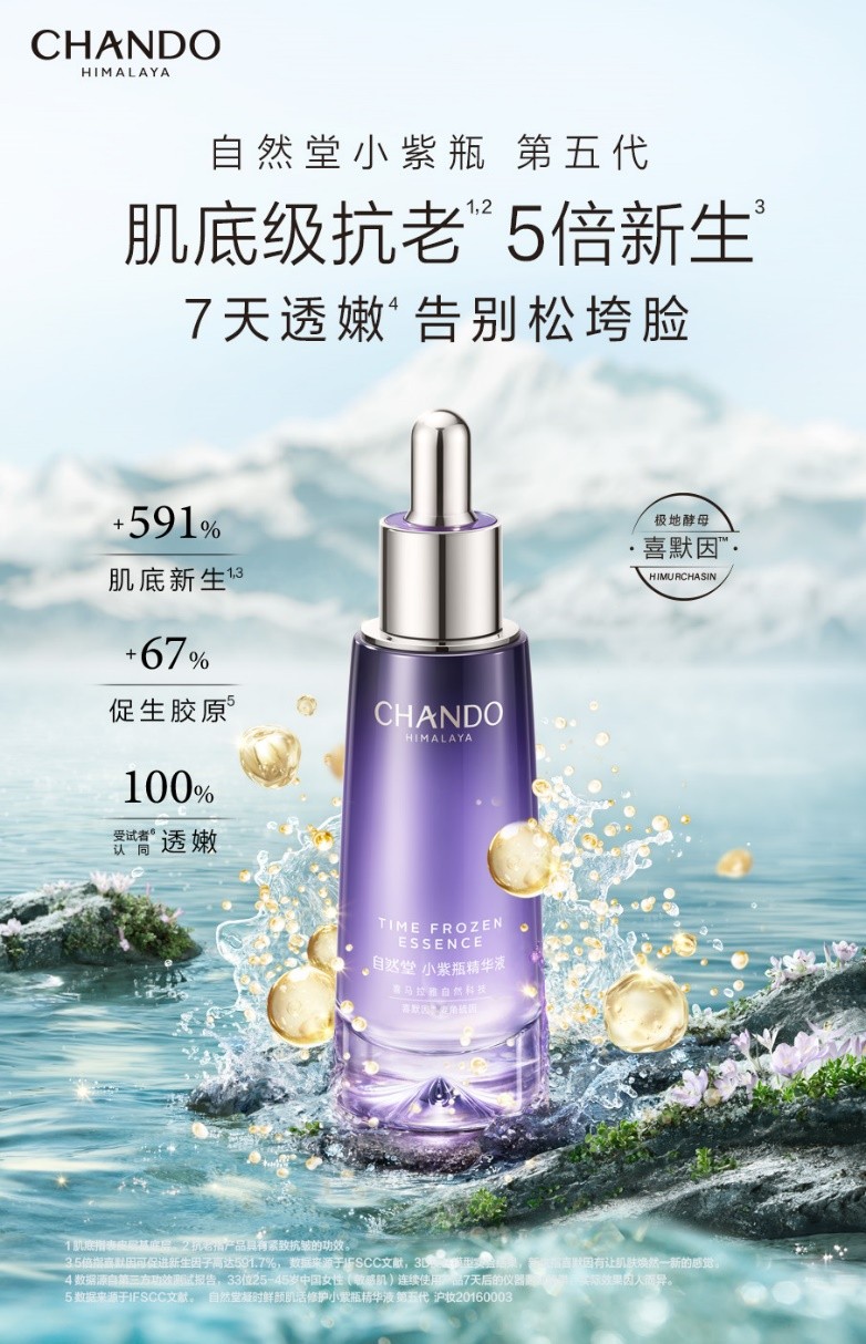 目前,喜默因已被应用在自然堂小紫瓶精华第五代、自然堂极地圣水、自然堂头皮护理系列等一众产品中。作为首款添加中国自研成分极地酵母喜默因的产品,自然堂小紫瓶第五代在原有功效的基础上进一步提升,边修护边新生,5倍提升新生因子,帮助肌底层细胞焕新,更显细嫩透亮。