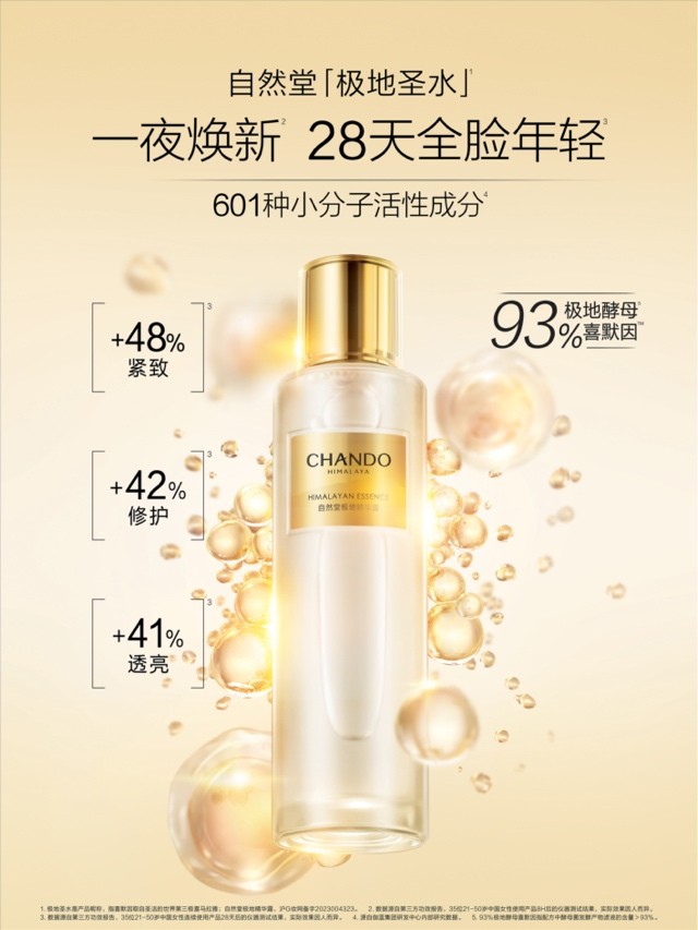 全新上市的自然堂「极地圣水」也是应用了极地酵母喜默因的代表性产品。作为自然堂首款无水精华水,自然堂「极地圣水」采用极简配方,全成分仅5个,喜默因含量高达93%,连续使用28天,肌肤显著年轻新生、更透更稳更紧致。