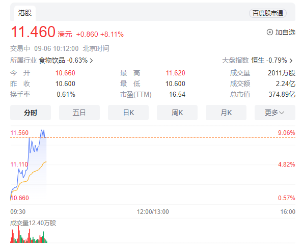 9月6日,珍酒李渡迎来“港股通”第二个交易日,继续高开高走,盘中一度大涨超9%,报11.62港元。截至上午收盘,珍酒李渡每股涨幅6.42%,报11.28港元,成交额2.856亿港元。