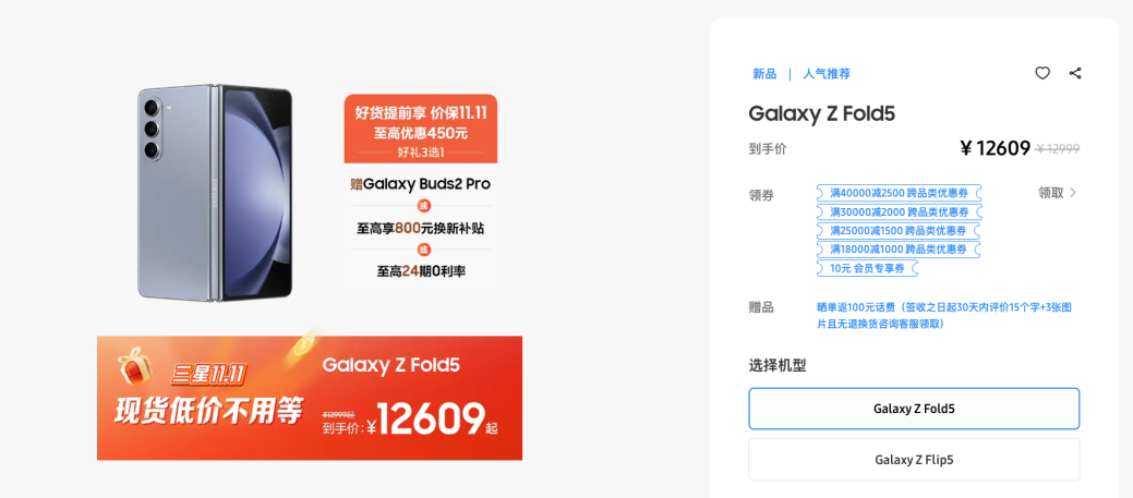 目前,三星商城已经正式开启“三星11.11 现货低价不用等”活动,其中购三星Galaxy Z Fold5至高优惠450元,到手仅12609元,并且保价双11.11。此外,用户购机还可享至高800元以旧换新补贴+6折保值换新或至高24期分期0利率或赠Galaxy Buds2 Pro无线耳机(颜色随机)+6折保值换新三选一好礼。