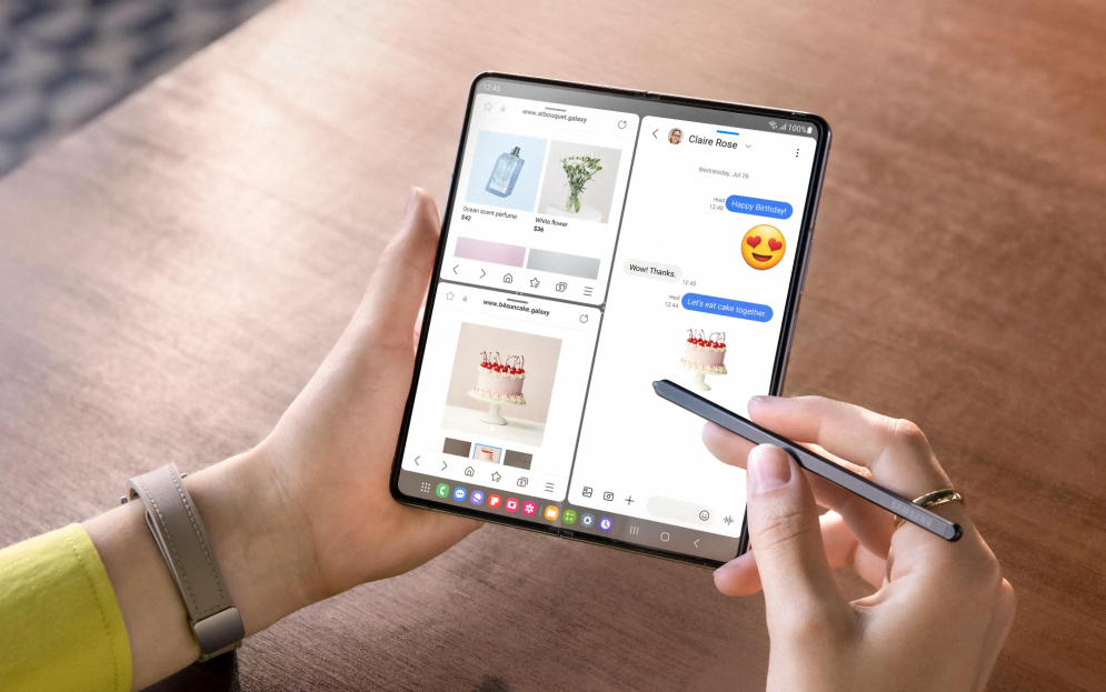 想要在娱乐和移动办公之间无缝切换,一块顶尖的大屏还远远不够。为此,三星Galaxy Z Fold5带来了深入场景的多任务处理能力,让折叠屏真正成为用户口袋里的生产力神器。除了强大的分屏能力,用户还能借助优化后弹窗视图功能将任意处于浮窗状态下的应用隐藏或呼出,更从容地应对繁琐的多任务。升级的底部任务栏采用了类PC 布局,能够实现一键切换APP。新增的双手拖放功能和新一代纤巧S Pen,则进一步起到事半功倍的作用,让用户面对文件编辑、绘图等复杂工作时更加游刃有余。