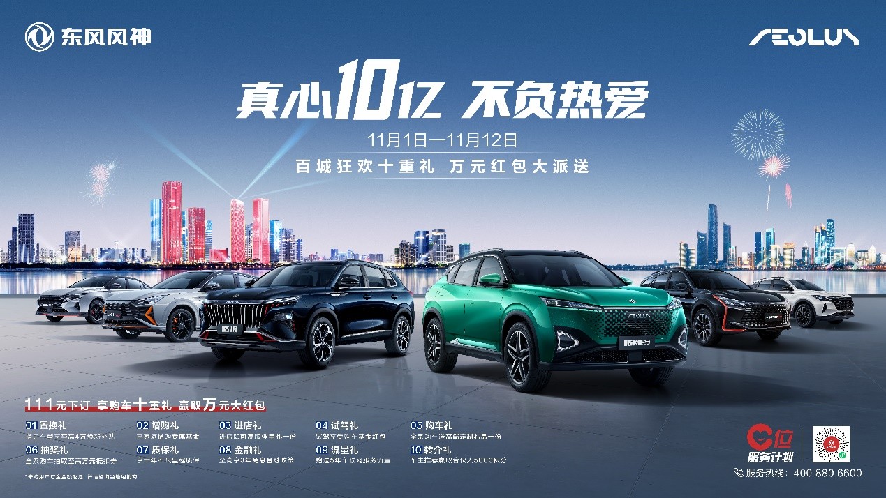 十一购物狂欢季,东风风神共飨盛宴。11月1—12日,东风风神重磅推出“真心10亿 不负热爱”为主题的购车钜惠活动,凡购东风风神全系车型(不含新能源、公牌大客户车辆)均享受万元红包大派送、百城狂欢十重礼福利,极大降低购车门槛,“真心10亿”助力更快上车!