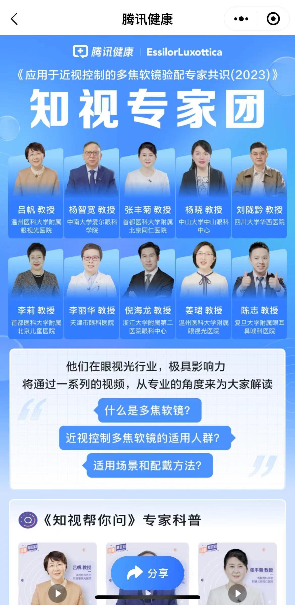 《应用于近视控制的多焦软镜验配专家共识》腾讯健康线上首发仪式
