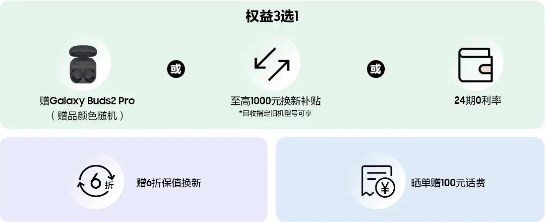 除了吸睛的外观设计和精彩的大屏体验,三星Galaxy Z Fold5还拥有旗舰级的影像系统,以及为影音、拍摄、办公等深度赋能的立式交互模式,可以说将折叠屏体验做到了极致。不仅如此,双11期间,三星商城推出了Galaxy Z Fold5的特惠购机活动,消费者不仅能领券后至高优惠750元,更可享受“赠Galaxy Buds2 Pro或至高享1000元换新补贴或至高24期0利率”3选1好礼,以及6折保值换新、晒单赠100元话费等礼遇。想要入手这款超人气潮流之作的朋友,不妨趁此难得机会为自己安排上吧!