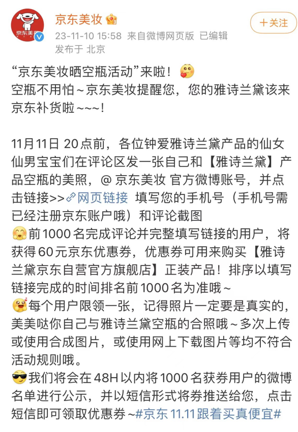11月10日,京东美妆联合雅诗兰黛发起“京东美妆晒空瓶活动”。即日起至11月11日 20点前,只要在@京东美妆 官方微博评论区晒出自己和雅诗兰黛产品空瓶的真实合照,并完善个人信息,前1000名完成评论的用户即可获得60元京东优惠券(每个用户ID限领一张),该优惠券可以用来购买雅诗兰黛京东自营官方旗舰店的正装产品。