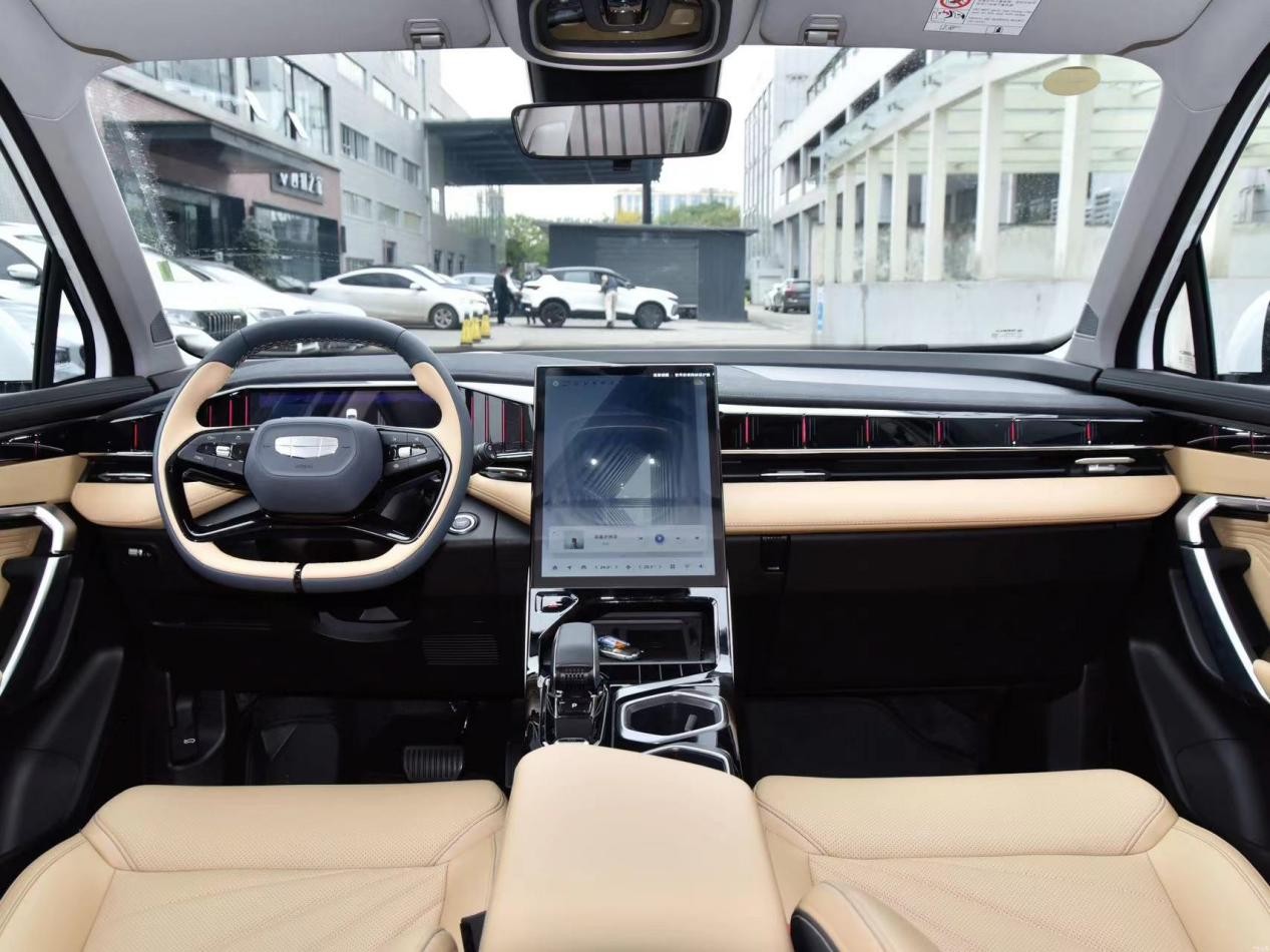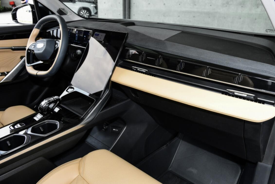 进入到车内,博越L车内的设计同样不输长安CS75 PLUS,如竖向排列的氛围灯以及大量皮质面料等,让人倍感豪华。车内搭载了吉利银河OS Air系统,全系配备了13.2英寸的竖置中控屏,支持卫星导航、语音控制识别功能以及网易云音乐等APP。