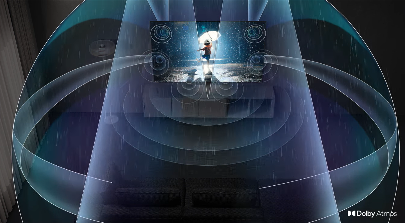 除了音画追踪OTS技术,神经元量子点处理器还带来了Q交响乐功能,通过对屏幕内容的分析和驱动,将电视内置的音响和三星条形音响协同作用,从三星条形音响的正面、侧面和上射式扬声器以及电视上的扬声器同步发声,利用多个交叉神经元打造的3D效果立体音场,搭配让声音更加真实的杜比全景声功能,为用户带来具象化的听感体验。