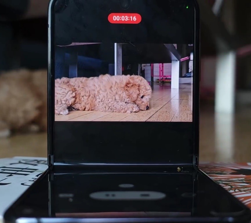 想给萌宠录制一段视频,用三星Galaxy Z Flip5同样方便。除了选用上述的立式自由拍摄方式录制外,你还可以手持半折叠形态的三星Galaxy Z Flip5,好似拿着一台DV机在拍摄大片,不但可以灵活地调整取景视角,还给拍摄过程增添了更多乐趣。