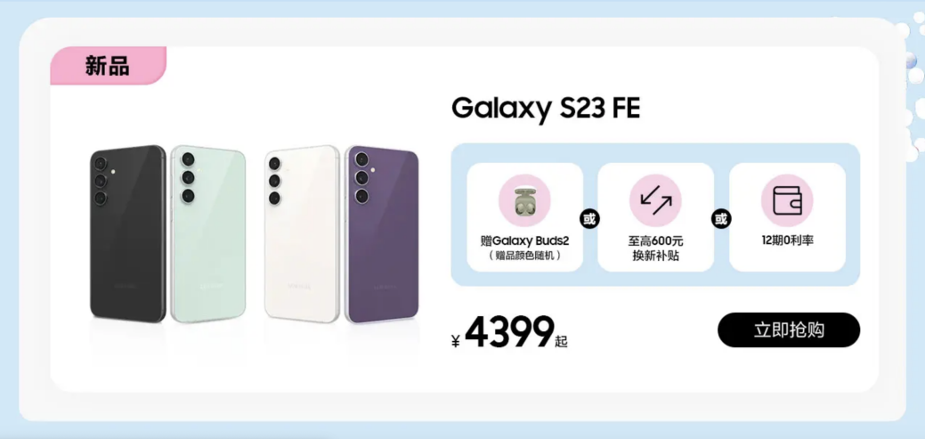 即刻,前往三星商城下单选购即有机会获得“三星Galaxy Buds2耳机”或“以旧换新补贴至高600元”或“至高12期0利率”三选一等惊喜购机礼遇。同时,消费者还可通过“随心搭”选购三星Galaxy S23 FE配件,尽享更多惊喜好礼。