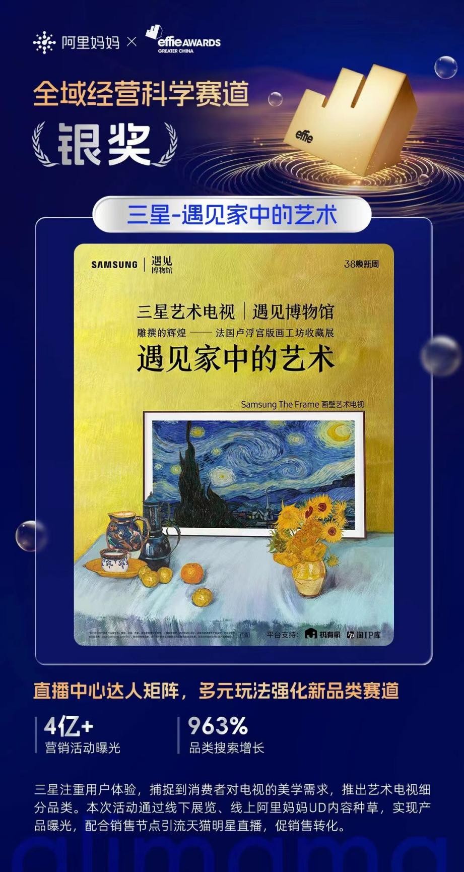 近日,以“持续变革,敢创未来”为主题的2023大中华区艾菲国际论坛&颁奖典礼于上海举办,三星“遇见家中的艺术”营销案例以超4亿活动曝光,品类搜索增长963%的傲人成绩以及多元化的营销打法,获2023大中华区艾菲奖全域科学经营赛道银奖。全域科学经营赛道由艾菲奖和阿里妈妈共同发起,旨在聚焦全域经营科学赋能的营销新玩法,表彰数智经济下不断变革的科学经营新思路。三星从多维度探寻品牌数智科学经营可能性,聚焦全球营销创新,与行业共探商业变革动能。