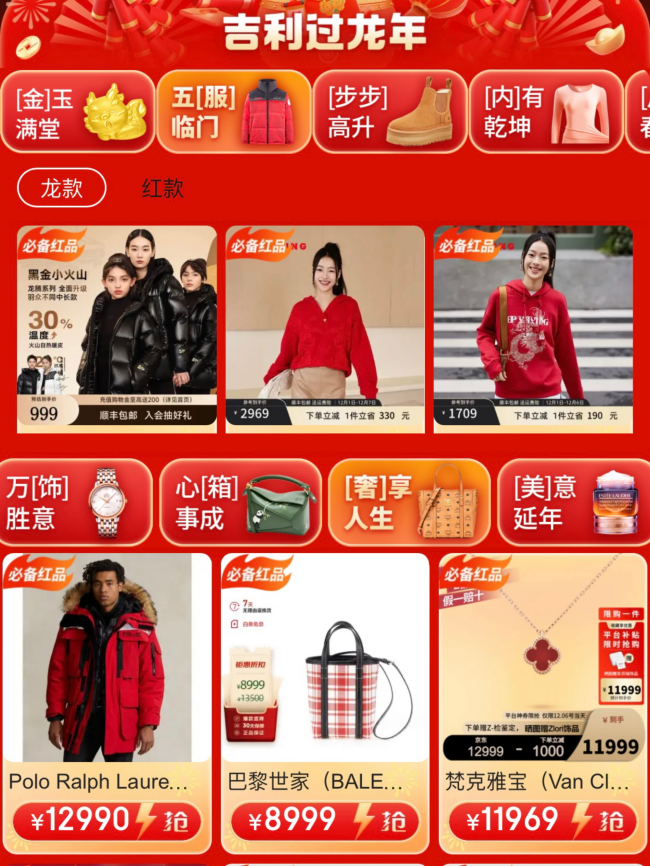 值得一提的是,临近新年,消费者选购年货的需求升温,京东美妆服饰12.12会场还特别上线了龙年新品专区,带来生肖龙款转运珠、红色美妆礼盒,以及龙元素、红色服饰鞋靴箱包等,让消费者趁着优惠活动提前购置新年货。