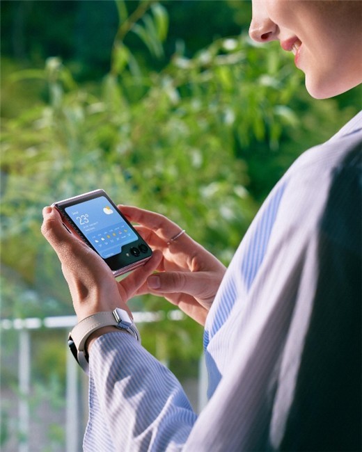 相对于三星Galaxy Z Fold5,小巧灵动、美观时尚的Galaxy Z Flip5更成为了女性用户以及时尚人士的挚爱。它采用了炫酷的竖向折叠形态:折叠时,用户可以将其舒适地握在手心;展开时,它将一块6.7英寸的屏幕呈现在用户面前。除此之外,Galaxy Z Flip5最惊艳的还要属背部那一块3.4英寸的大视野智能外屏,通过极致的设计,使其与后置镜头组巧妙的相融合,彰显出三星在设计上的超前理念。而为了让用户充分利用这块屏幕,三星还为其赋予了丰富的个性交互选项,用户可以根据自己的喜好,来调整外屏壁纸、主题、时钟样式,打造出自己专属的界面,每次点亮外屏都向外界传递出新鲜与活力。