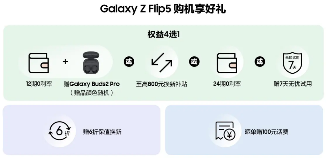 Z世代想要的是有别于传统的生活方式,而一台能在悦己的同时表达出个性态度的强力工具就是他们的最佳助手。三星Galaxy Z Flip5就以标新立异的形态设计和打破定式的用机方式,构建出了崭新的智能移动体验,与年轻群体的前沿理念相连接,成为了他们的首选机型。目前,于三星商城下单Galaxy Z Flip5的消费者,可享受至高立省500元的优惠,还有权益4选1、赠6折保值换新、晒单赠话费等好礼相迎,想要在年底换机的年轻朋友们快来选购吧。