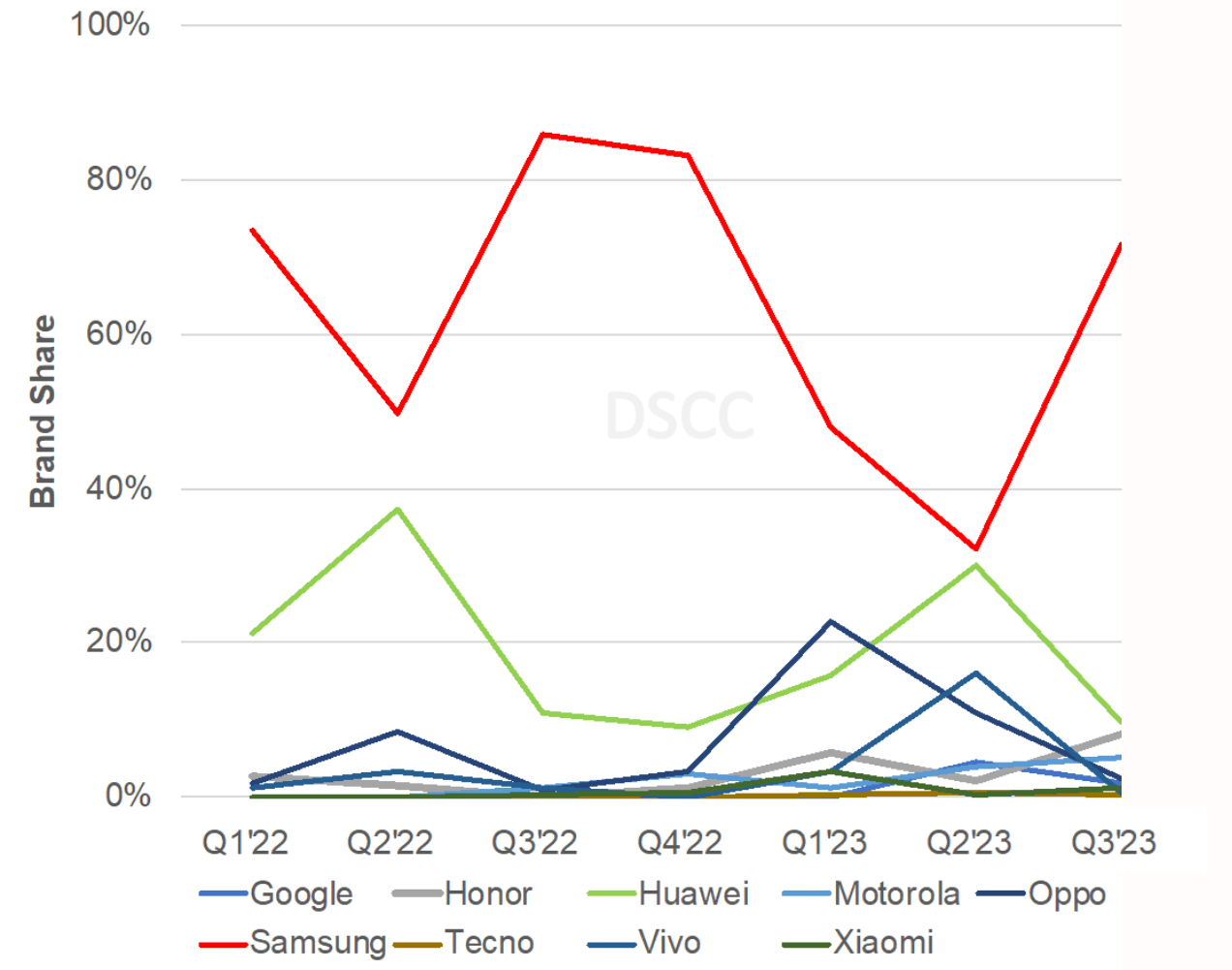 时值年末,各大调研机构也纷纷发布了Q3季度的数据报告,为手机市场带来了更高的关注度。近日,根据DSCC发布的2023年折叠屏手机市场报告显示,Q3季度全球折叠屏手机市场,出货量比上一季度增长215%,达到700万台,年度同比增长16%。这当中,三星得益于Galaxy Z Fold5和Galaxy Z Flip5 等产品的推出,以72%的市场份额位居榜首,大幅领先其他品牌。