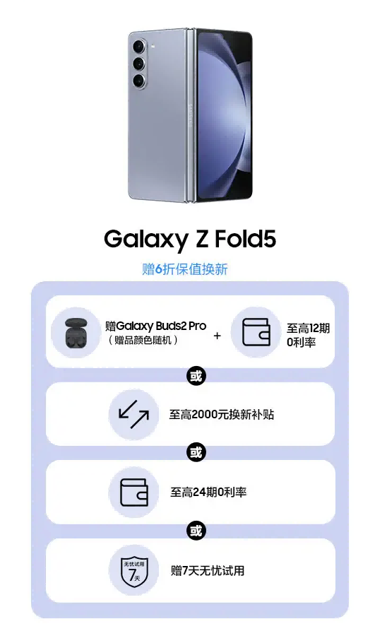 值得一提的,为了回馈广大消费者的支持,在圣诞节和元旦双节来临之际,三星“年终盛惠 好价焕新”活动火热开启,三星Galaxy系列产品以丰厚的优惠和惊喜福利全面解锁年终礼遇,助力大家轻松换新,正是下定三星Galaxy Z Fold5的好时机。此次活动中,凡是在三星商城选购Galaxy Z Fold5的消费者均可获赠“至高12期0利率+赠Galaxy Buds2 Pro耳机、或至高2000元以旧换新补贴、或至高24期0利率、或赠7天无忧试用”好礼四选一以及6折保值换新、多重星选福利等。