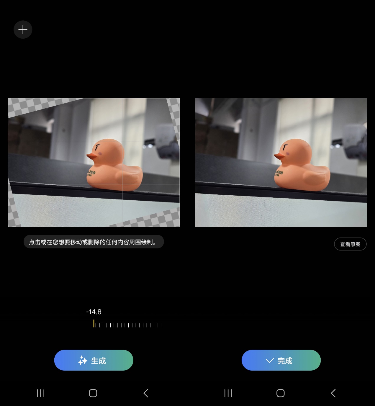 同样借助AI,三星Galaxy S24丰富了照片的后期编辑场景。如我们常见的照片拍歪了或是照片中出现了不该出现的人或物的时候,就可以使用生成式编辑功能,在裁切旋转图片的时候智能填充边缘,还能在移动或移除画面对象后智能填充空白。三星生成式AI能力的非常强大,因此所产出的画面并没有以往那种不自然的感觉,相当逼真且自然。