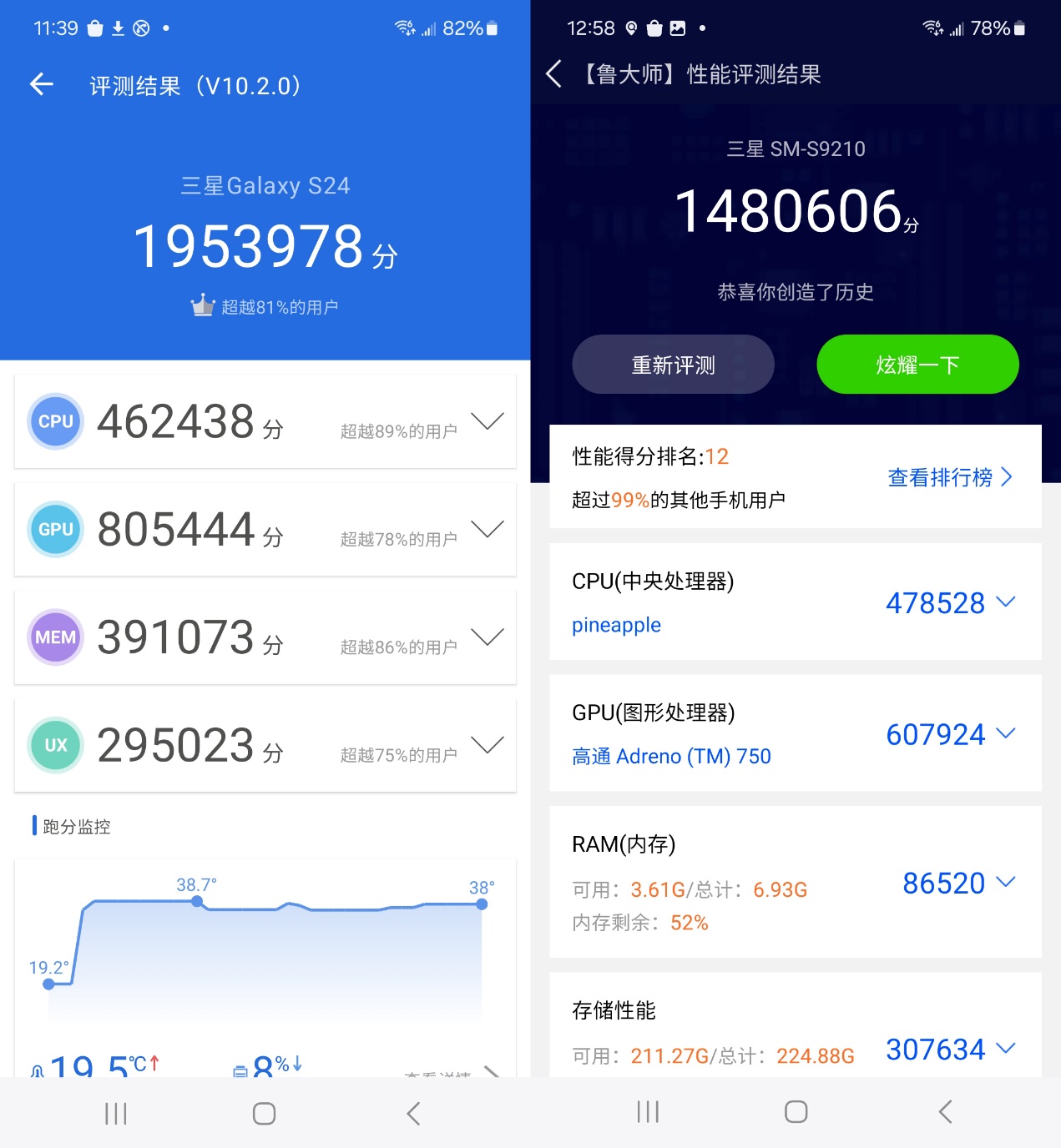 从安兔兔和鲁大师上跑分的情况来看,三星Galaxy S24性能得分方面发挥正常。其在安兔兔上跑出了1953978的高分,在鲁大师上则跑出了1480606分。相信这样的性能表现能满足多样化应用的需求。
