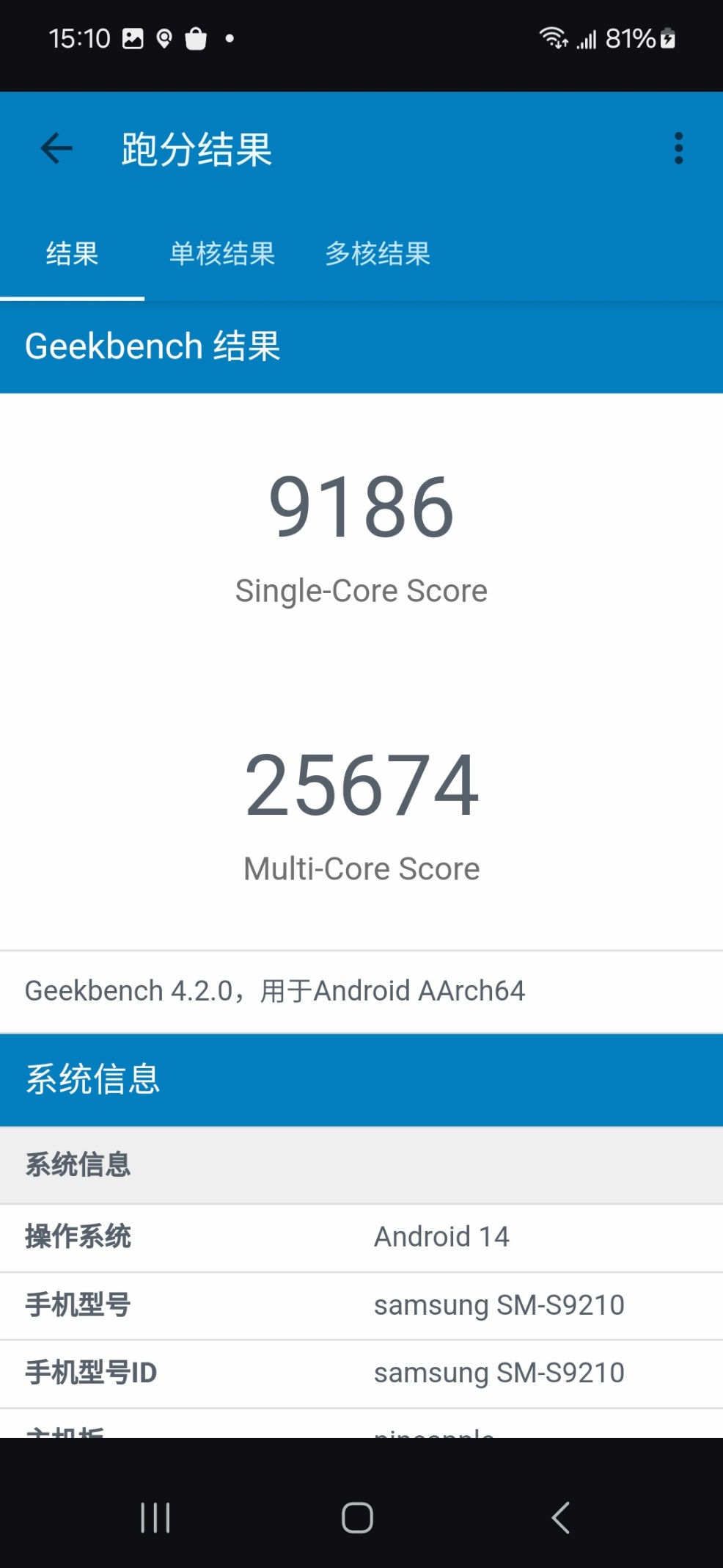 在Geekbench测试中,单核成绩9186,多核成绩25674。