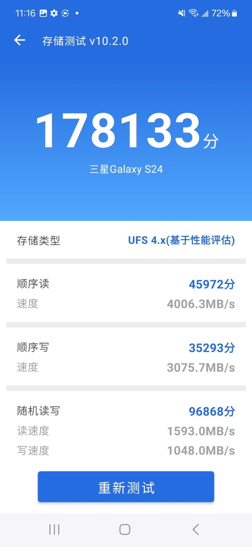 在内存读写性能方面,三星Galaxy S24在安兔兔测试的结果是,其连续读取速度为4006.3MB/s,连续写入速度为3075.7MB/s,随机读写速度也可达到1593MB/s的读取速度和1048MB/s的写入速度。